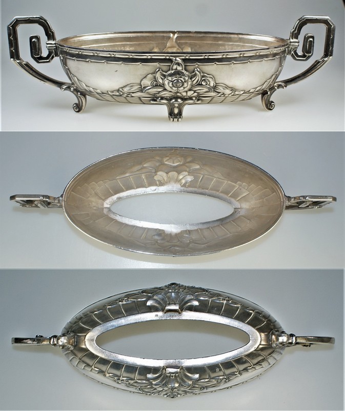 ガラスの中鉢が入った細長い楕円形の両手、4本足付きの外鉢は銀鍍金された真鍮製で、アール・デコ的にデフォルメされた花のモティーフが型でレリーフされております。