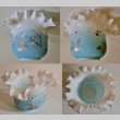 空色を暈し染めした白オパリーヌ(ミルクガラス)に木瓜と思しき花枝がエナメル彩で描かれた油壷と揃いのチューリップ(シェード)が付いた小さな石油ランプです。