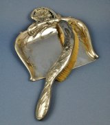 小さな取っ手が付いた帆立貝の形をした小皿に小花模様がレリーフされた可愛らしい銀器です。 小さいながらも良く出来ており、裏には珠状の三脚も付いております。 ワインテイスター或いは個別の灰皿かも知れま…