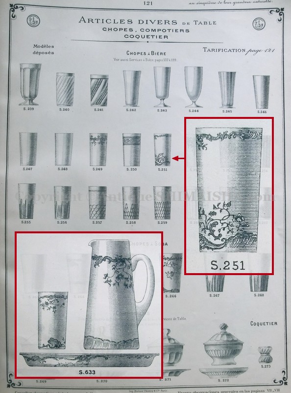 資料画像は、バカラの1907年版テーブルウェアカタログからのコピーで、chope(ショップ=ビールグラス)のページ、同ページに貼り付けたビールセットのページからの抜粋、パターン毎のページです。