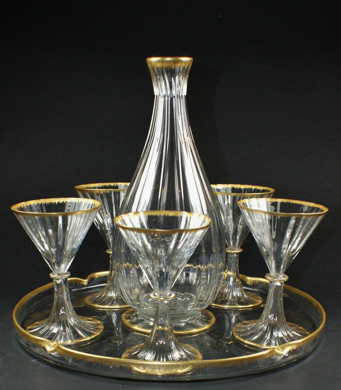 コート・ヴェニシエンヌ*が施された無色透明のガラスに金彩で縁取りをほどこした1890年代のドームの定番的なシリーズで、色々な形、用途のグラス類が作られました。