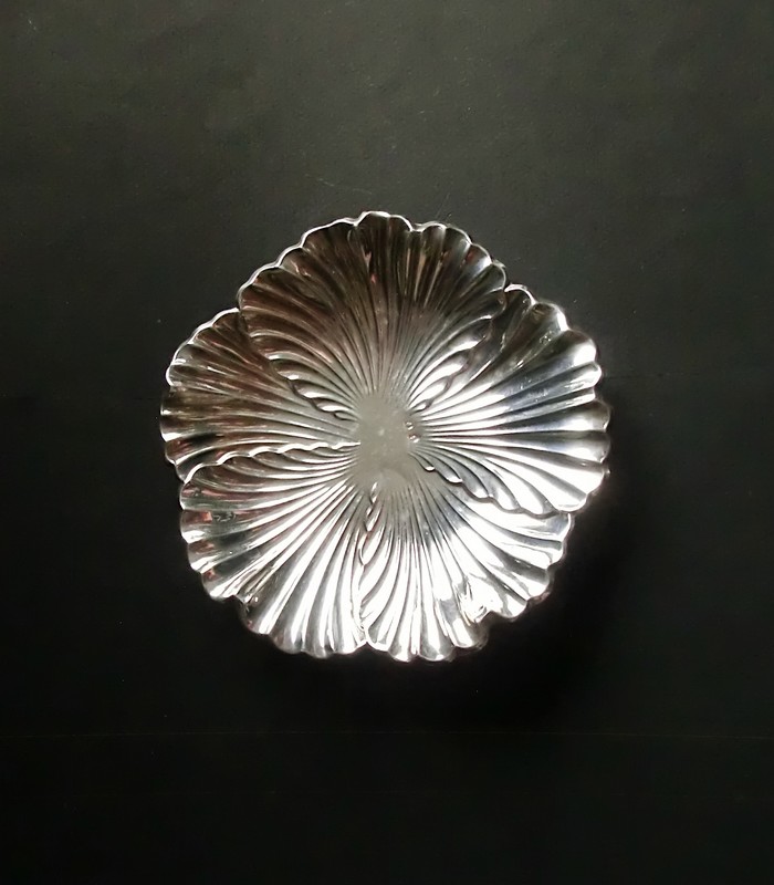 ケシの花のような繊細なプリーツのある花弁が5枚重なり合った花形がアールヌーヴォー風で美しい足つきミニトレーです。