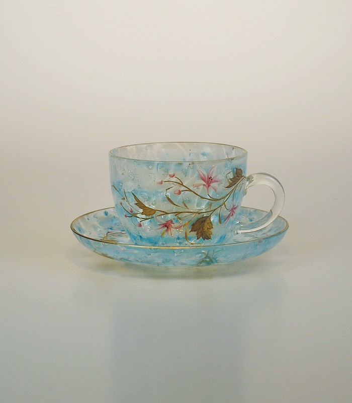 透明な色ガラスに乳白の吹雪が渦巻き、更に小さな銀箔が散りばめられており、その上、金彩とエナメル彩で花絵が描かれております。