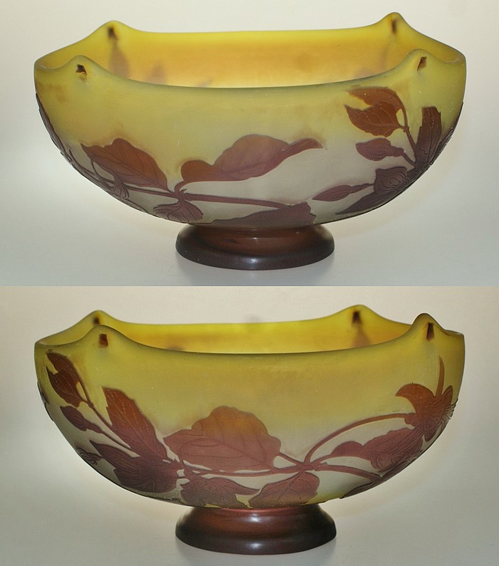 白、黄色、オレンジ、青緑、紫などを重ねた多層被せガラスにアシッドでフクシアの花や葉や蕾をカメオ彫りした美しい器です。