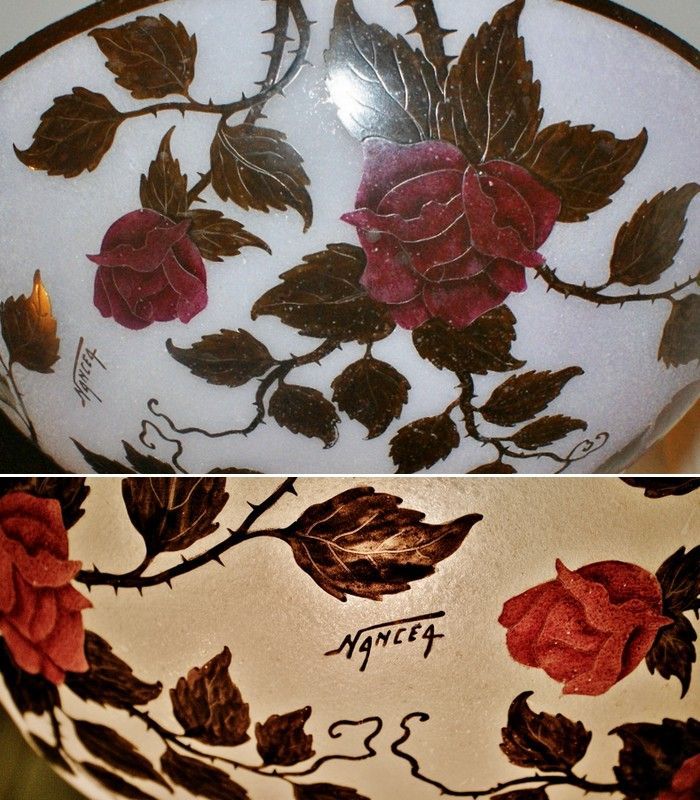 文字通りジヴレ(凍り付いた)したようなザラっとしたジヴレ地の淡いピンク色を帯びたガラスにアシッドで薔薇の花が浮き彫りされ、エナメル彩が施されたヴァスク型プラフォニエです。