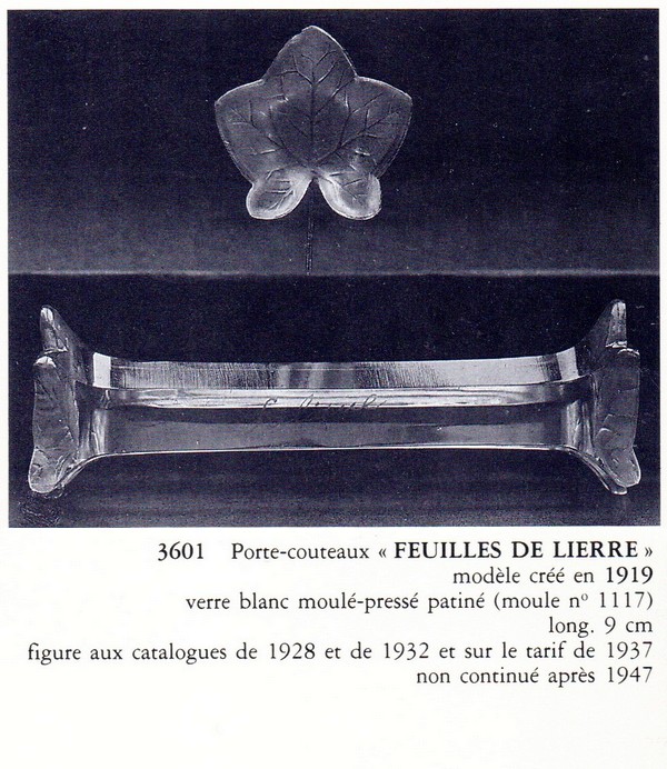 『フイユ・ド・リエール』(蔦の葉)と名付けられたルネ・ラリック1919年のたいへん稀少なナイフレストです。