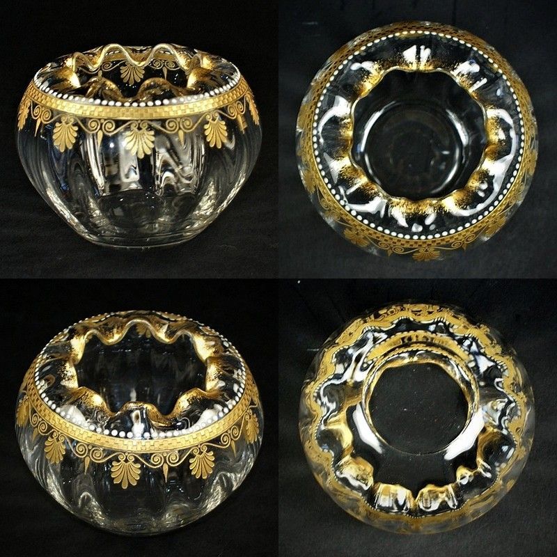 コート・ヴェニシエンヌ*がほどこされた無色透明のクリスタルにエッチング、金彩、エナメル彩で繊細に装飾が加えられた珠玉の小品です。
