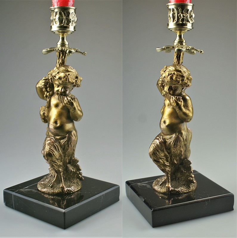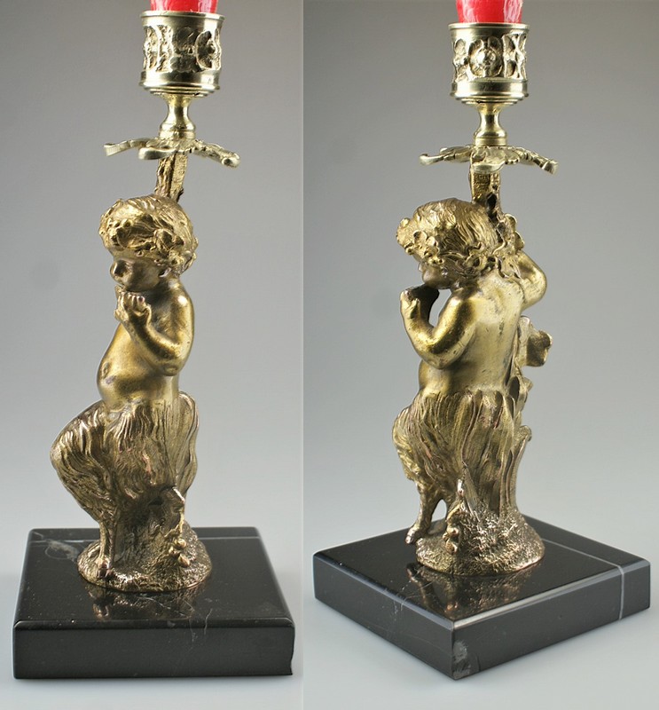 葡萄の木に寄りかかっていわゆるパーンの笛を吹く幼いパーン(半獣神、牧神)が可愛らしい小さなブロンズ像がキャンドルスタンドになっております。
