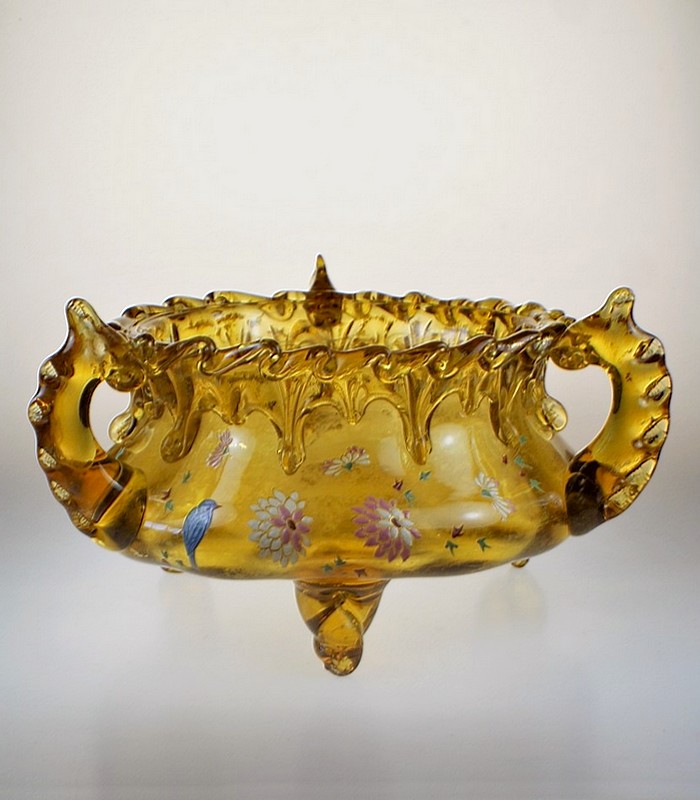 ダイナミックな造形の取っ手や脚や縁飾りが溶着された琥珀色のガラスの鉢に、エナメル彩で鳥や花が描かれた大きなジャルディニエールです。
