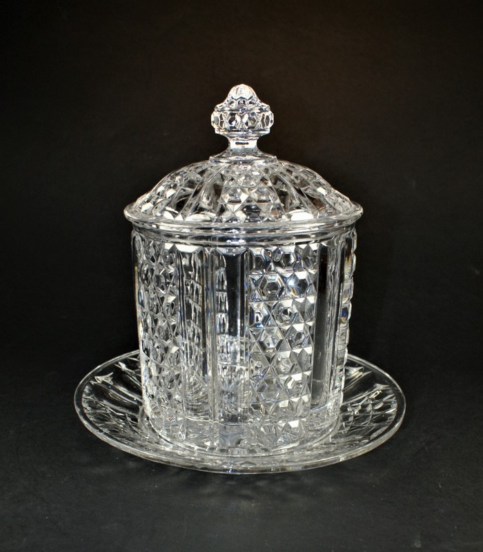 バカラの古い型パターンの珍しいビスケットジャーと揃いの受皿のセットです。