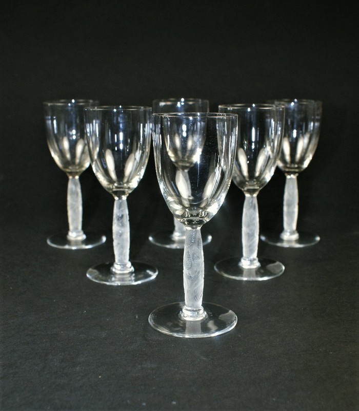 蔓系植物の葉のモティーフがレリーフされ、フロスト状にパティネが施されたステムがラリックらしく綺麗なグラスです。