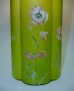 マット仕上げの半透明な明るいモスグリーンのガラスに、コクリコの花がエナメル彩で絵付けされ、上部にロカイユ模様が金彩で施されております。