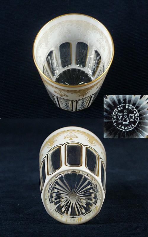 無色透明なクリスタルに白オパリーヌを被せ、窓を開け、オパリーヌ部分にはエッチングで模様を刻み金彩を入れた非常に凝った造りのゴブレです。