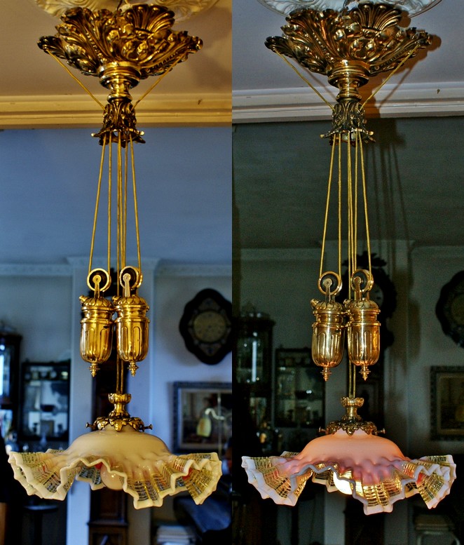 踊るバレリーナのチュチュのような電笠は、白オパリーヌ(色を入れて不透明にしたガラスやクリスタル)とピンクのオパリーヌを重ね、更にクリアな部分にはウランガラスの線条が巻き付けられている非常に凝った美しいものです。