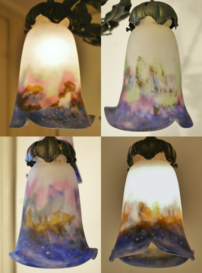 Mullerならではの美しい色彩の斑文ガラスのチューリップ(シェード)が4個も付いた素敵なシャンデリアです。
