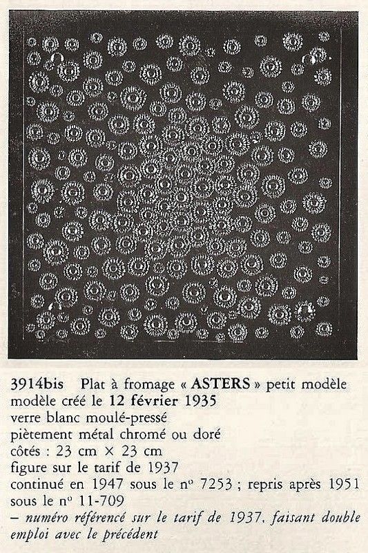 アスター(小菊)と名付けられたこのルネ・ラリック1935年のパターンは、皿や鉢など各種のテーブルウェアに展開されましたが、元々は建築材料のガラス・タイルとして壁や床に嵌め込んで使用されるべく、1934年に作られたものが原型だったようです。