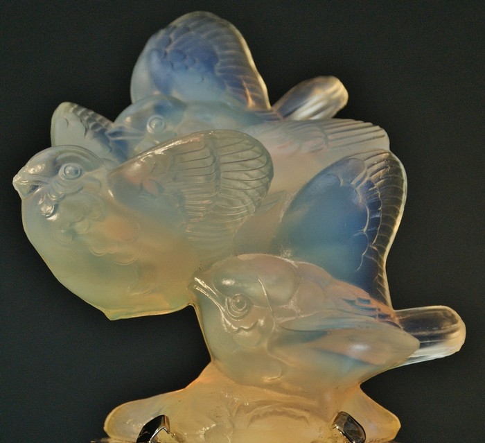 本品は、その中でも代表的な小鳥のフィギュアをヴェイユーズに仕立てた珍しいもので、『飛び立つ小鳥達』と題されておりますが、三羽の雀が仲良く飛ぶさまが可愛らしく躍動的に表現された傑作です。