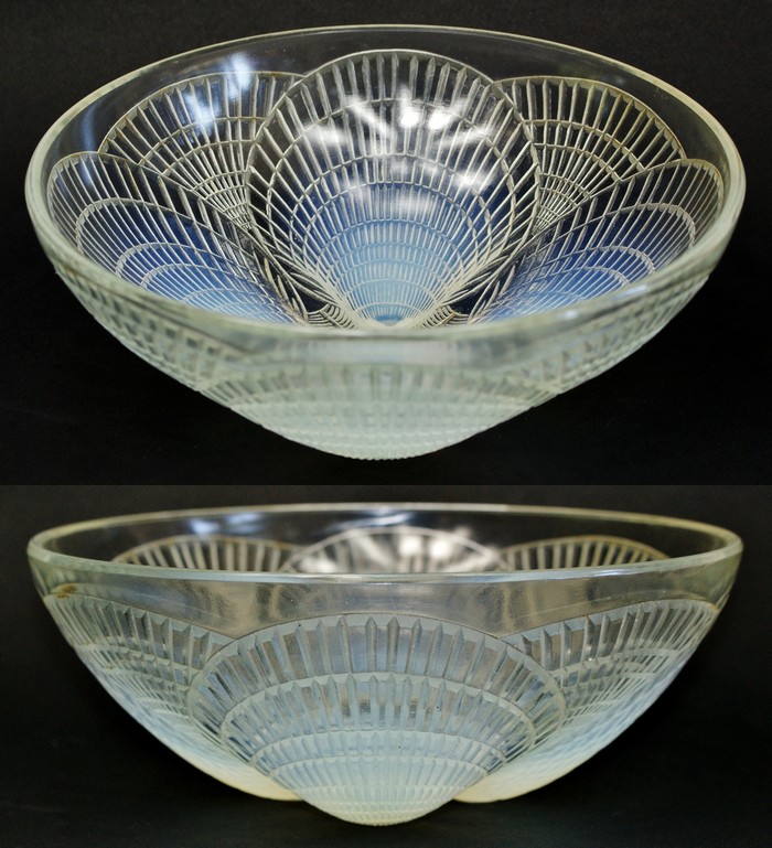 ルネ・ラリックの代表作の一つとも言えるほどよく知られたコキーユ(貝)のブルー・オパルセント・ヴァージョンの大きな深鉢です。