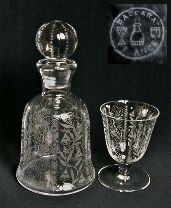 かつてフランスのサクランボ酒のメーカーがこのキャラフ入りの限定品を出し、底に酒造会社の名入りマークの付いたものも何度か入手しましたが、本品はバカラのスタンダード品です。特注品とは口のシェイプが違います。