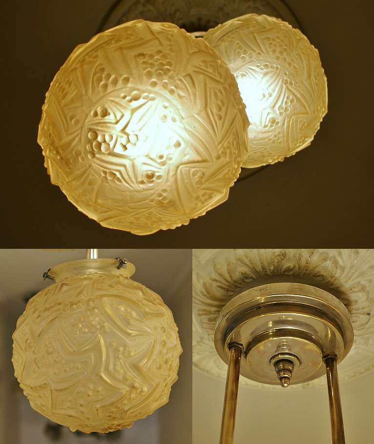 アールデコ的なレリーフ模様がラリックの花瓶を想わせるボール型シェードは、黄色を帯びたガラスの表面にサティネ加工が施されております。