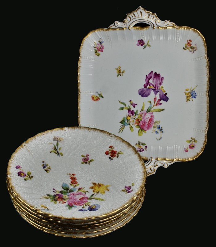 昔のカタログによると、ウィーン型の『サックス風花絵(いわゆるドイツの花)と金彩』パターンに属すテーブルウェアです。