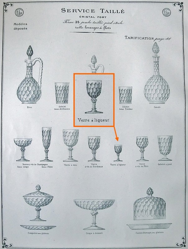 資料画像はバカラの1907年版テーブルウェア・カタログからの抜粋ですが、当時はジュヴィジーという名前はまだなく、『フォルム35』と呼ばれていたようです。大統領官邸で使われるようになってからは『エリゼ』とも呼ばれますが、『ニーム』と呼ばれるカットが微妙に違うヴァージョンもあり複雑です。