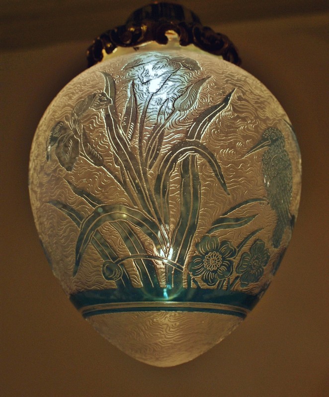無色に水色を被せ、あやめや水仙の花とカワセミのような鳥が素朴ジャポニズムタッチでエッチングされた珍しいサン・ルイのシェードです。