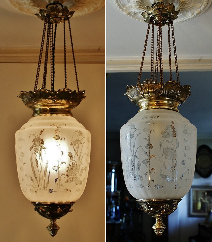 上部のチェーンは滑車で動き、下の金具を引っ張るとシェードが持ち上がって蝋燭を点けたり消したり出来るようになっております。