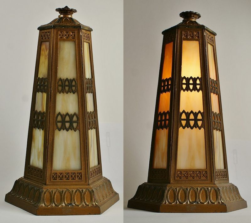 フレームは軟らかめな合金を型成形して塗装したもので、ガラスはスタンドグラスに使われるオパルセントを帯びた斑文板ガラスが6面フレームの内側にはめ込まれております。