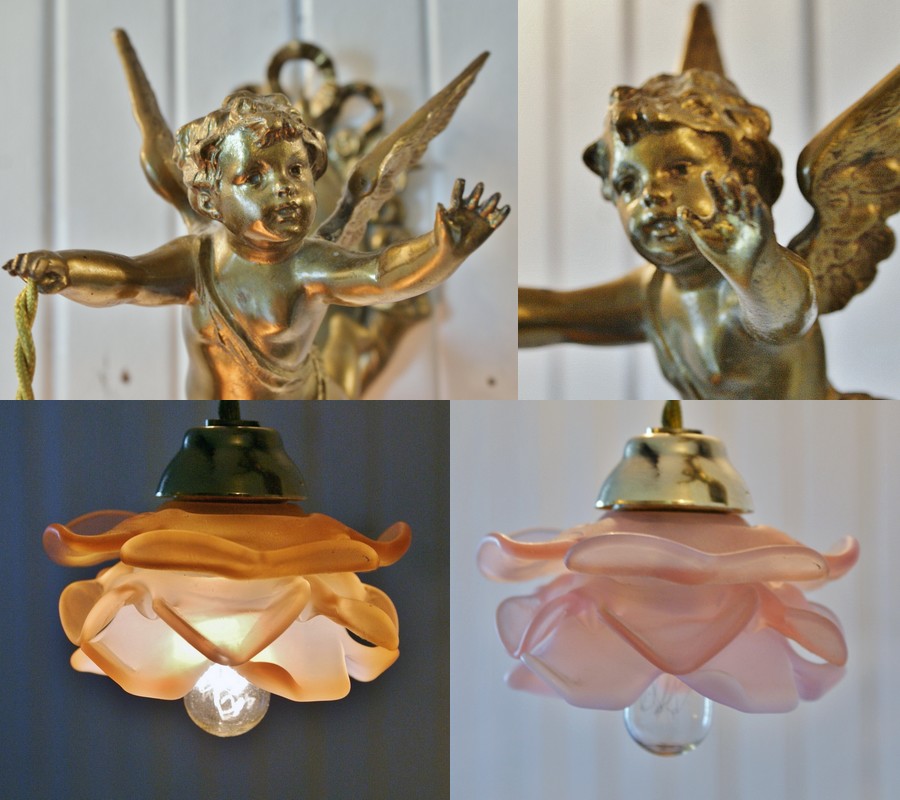 なんとも可愛らしい顔をしたべべ・エンゼルが、これまた小さなバラのシェードを手に提げたキュートなアプリック(壁灯)です。