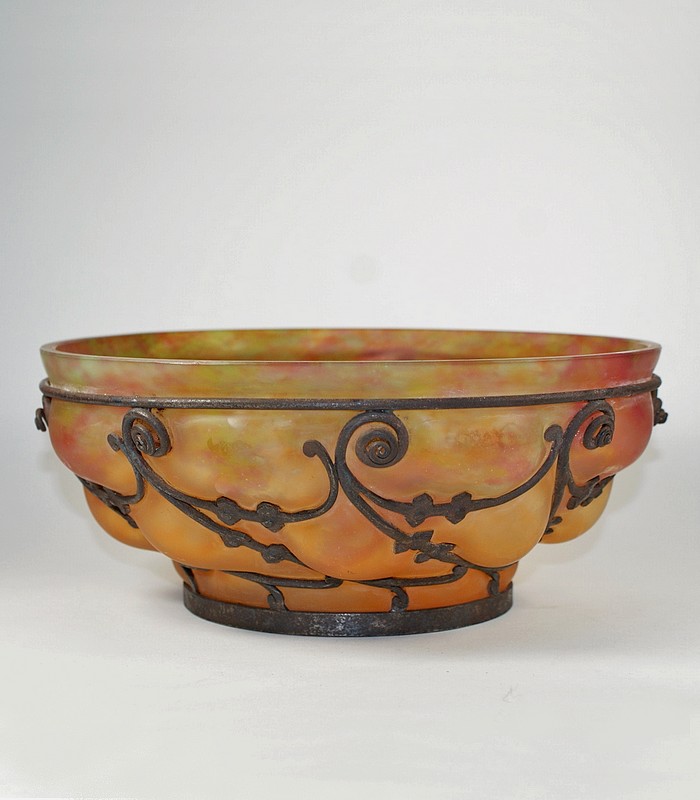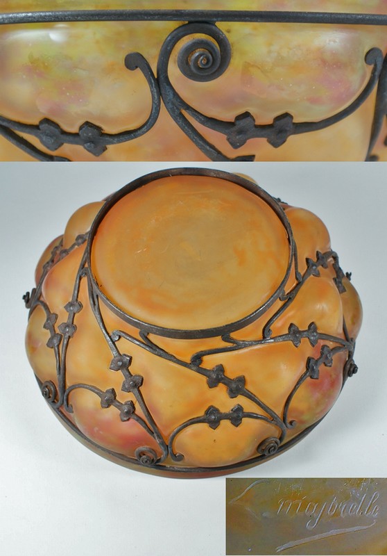 鍛鉄のフレームにガラスを吹き込んで作られたもので、マジョレルが考案したこの技法とスタイルは模倣され、工芸ガラスの一つのジャンルとして定着した感さえありますが、本品は正真正銘、元祖ドーム&マジョレルによる作品です。