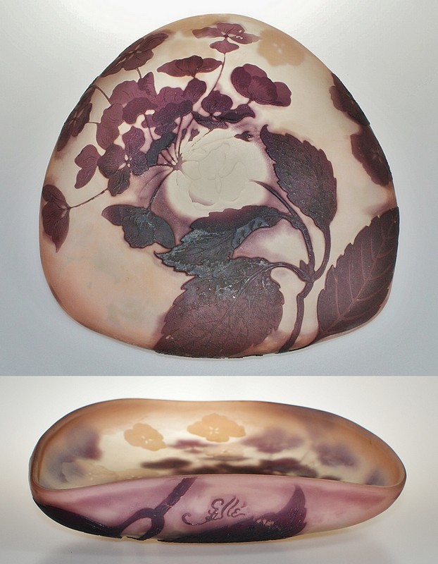 無色ガラスの器の内側に不透明なピンクを被せ、外側に紫を被せた三層のガラスの両面に、それぞれ紫陽花の花や葉がアシッドでカメオ彫りされており、透かして見ると双方の模様が重なり合って奥行きのある絵になるという仕掛けです。
