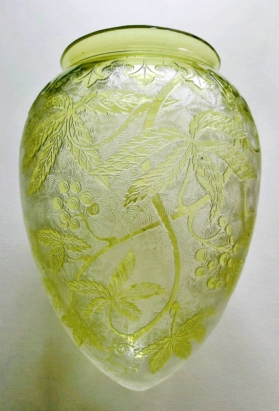 無色に黄緑色を被せ、蜘蛛の巣のような地紋と蔦(ヴァージニア蔦)がエッチングで彫られたサン・ルイのクリスタルシェードが美しいプラフォニエです。