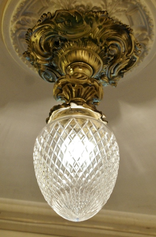 無色透明なクリスタルにカットを施した大きなグローブが、大胆にうねったロカイユ模様が見事なブロンズ台に付いた迫力満点のプラフォニエです。