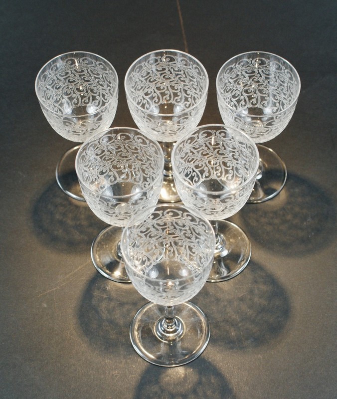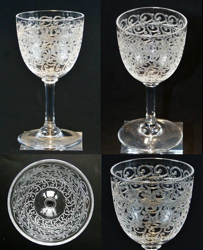 エッチングで刻まれた蛸唐草によく似たアラベスク模様が、透明クリスタルの表面をレースのように覆い、冷たい飲物を入れると半透明の霧氷のように見え、とても綺麗です。