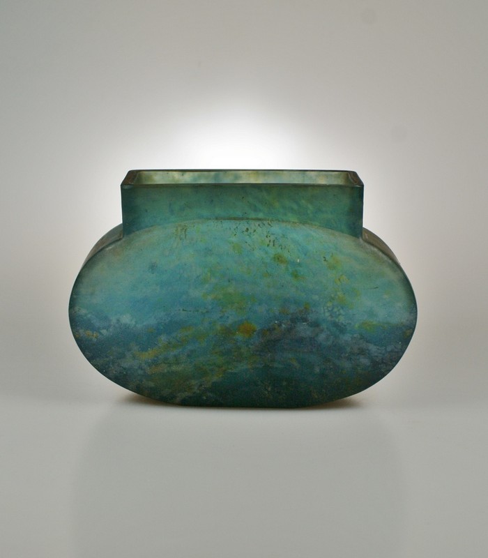 無色のガラスにヴィトリフィカシオンで青緑色、白、黄土色、鉄紺色などの斑文が入ったジャルディニエール型花器です。